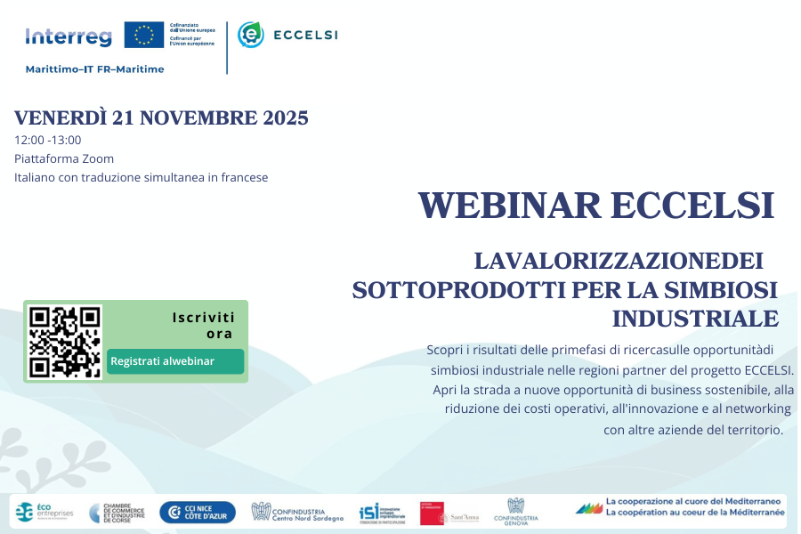Il progetto ECCELSI - Economia Circolare Cooperativa Esercitando la Leva della Simbiosi Industriale, co-finanziato dal Programma Interreg Italia-Francia Marittimo 2021-2027, vede capofila la Fondazione per l’Innovazione e lo Sviluppo Imprenditoriale di Pisa, con i partner: Scuola Superiore di Studi Universitari e di Perfezionamento Sant'Anna di Pisa, Confindustria Centro Nord Sardegna, Confindustria Genova, Camera di Commercio della Corsica, Camera di Commercio Nizza e Costa Azzurra, EA Eco-entreprises.
