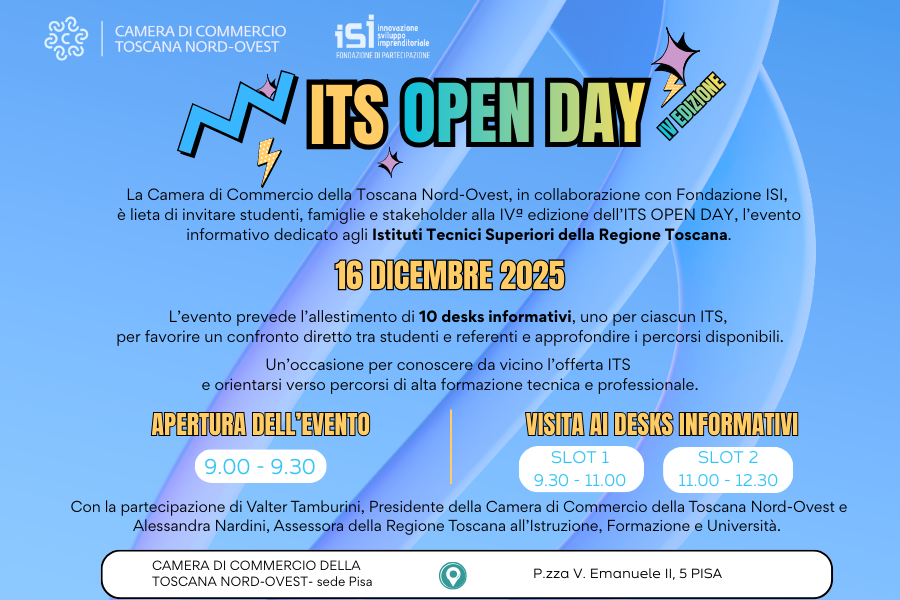 Il 16 dicembre 2025, dalle 9:00 alle 12:30, la Camera di Commercio della Toscana Nord Ovest – sede di Pisa – ospiterà la IV edizione dell’ITS Open Day, un evento pensato per offrire agli studenti delle scuole di Pisa, Lucca e Massa-Carrara, una panoramica chiara e concreta sulle opportunità formative post-diploma offerte dagli Istituti Tecnici Superiori della Toscana.